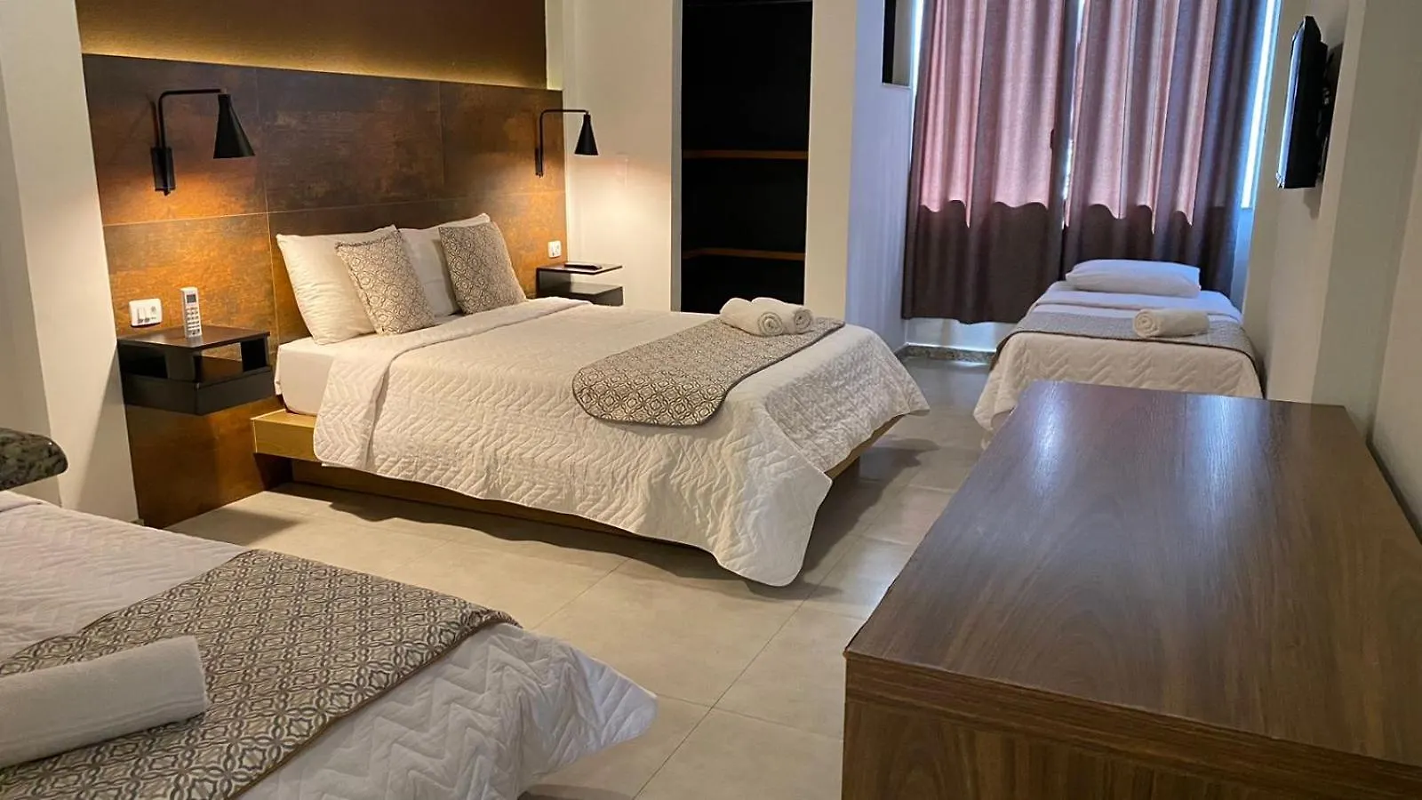 Os quartos do Malibu Palace Hotel têm mini frigobar, cofre pessoal e TV de tela plana com canais via satélite, bem como banheiro separado e chuveiro.